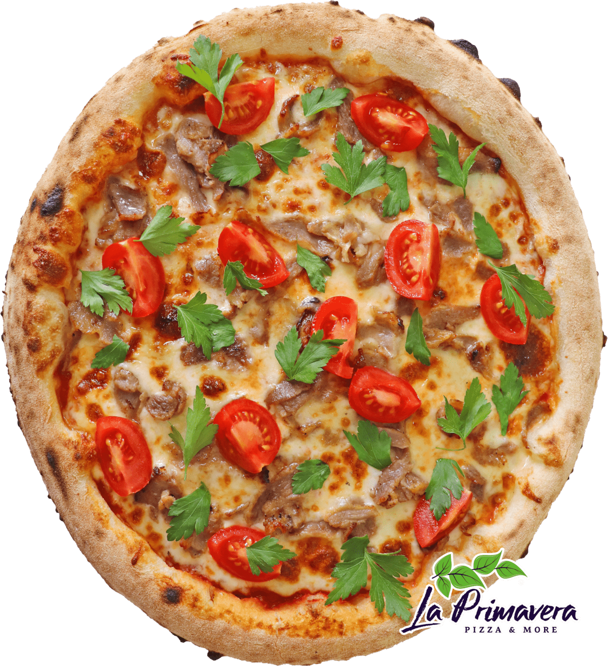 Blat pizza / Sos de rosii / Mozzarella / Carne de vita / Rosii cherry / Patrunjel